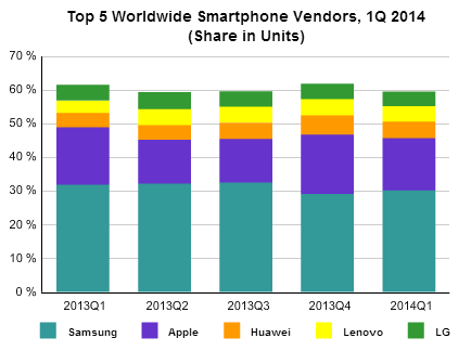 In the first quarter of 2014, Samsung topped the global smartphone market with 30.2% market share on shipments of 85 million (+22% YoY), according to market research firm IDC. Strong demand for Galaxy S and Note models, including the company's low-cost offerings, helped sustain Samsung's dominant position. Apple followed and accounted for 15.5% share on 43.7 million units (+16.8% YoY). Apple's growth stems from strong sales of the iPhone 5S in mature markets and continued success of the earlier 4S model in emerging markets.