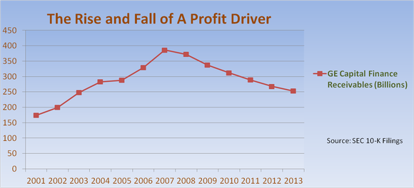 This September will mark 13 years for Immelt as GE's CEO. You can see a significant storyline in Immelt's tenure in, of all things, the arc of GE Capital's finance receivables. These receivables -- that is, the personal and commerical loans GE originates through its finance arm -- are key drivers of the division's profitability, and that of the overall organization. Finance receivables have both expanded and declined as GE's strategy has evolved since Immelt replaced Jack Welch in 2001: