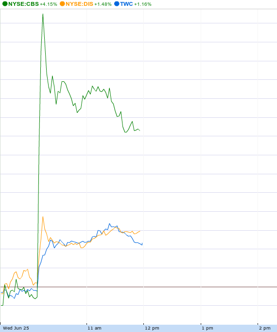 As you might have expected, broadcasters and content producers soared in unison on the SCOTUS decision. Burning the production/distribution candle at both ends, CBS (CBS +0.00%) gained as much as 8.3% on the news. You've already seen how content producer Disney maxed out at 1.9%, while broadcasting specialist Time Warner Cable (NYSE: TWC) rose as much as 1.7%. See if you can spot the exact time of the SCOTUS decision in this chart: