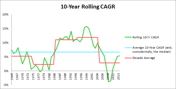 Each point on the green line shows your return (including dividends) if you'd bought and held the S&P 500 10 years prior to that point. For instance, the green line is at 15% in 2000, indicating that if you'd invested in the S&P 500 in 1990, your 10-year compound annual growth rate would be 15%. The blue line is the median (and average) annual return for all 10-year periods since 1954. The red line is the average 10-year CAGR for periods ending in each decade. Data Source: Yahoo! Finance.