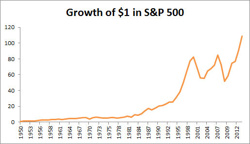 If you had invested $1 in the S&P 500 on June 2, 1950, it would have grown to $108.82 -- dividends included -- on June 2, 2014. That's a 7.6% compound annual growth rate, or CAGR, over the 64-year period. So 7.6% might be a minimum return we'd want from Keurig.