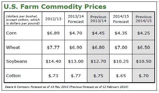 In 2014 the production of grains in the U.S. is expected to be up resulting in lower prices of commodities, such as corn and soybeans, which will reduce farmers' net income. The U.S. Department of Agriculture forecasts farm cash receipts to go down 12% in 2014. With budget constraints, farmers are likely to postpone their purchases of high-horsepower farm equipment. But once the buying power returns, there will be considerable pent up demand to support sales growth.