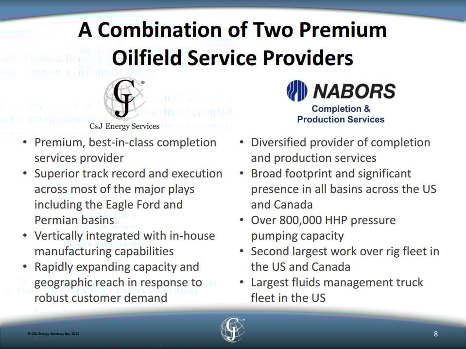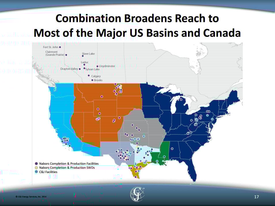 As this next slide shows, the combination is taking C&J's premier positions in key shale plays and broadening that reach by combining with Nabors' larger scale and diversifying it into production services.
