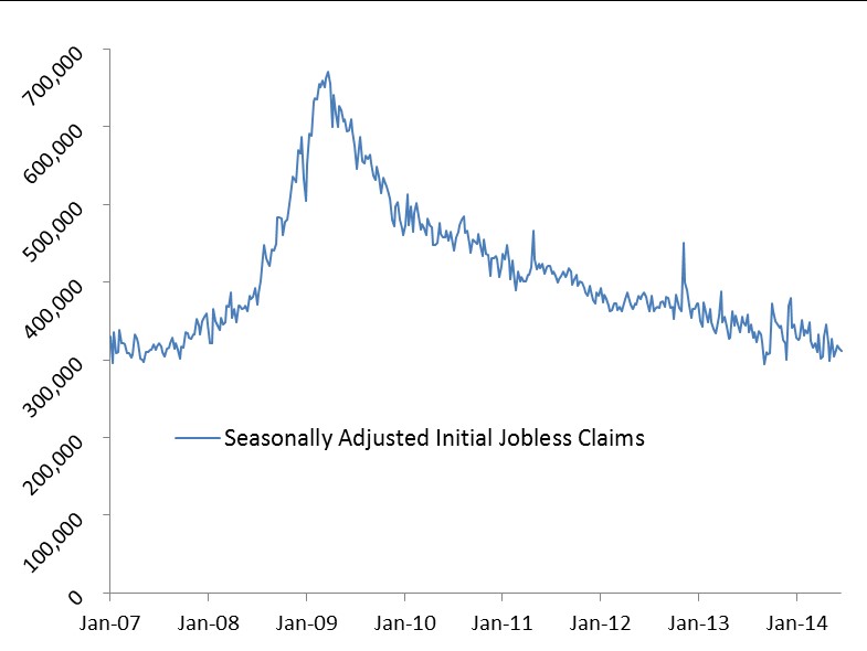 From a more long-term perspective, a 0.6% increase in the four-week moving average to 314,250 initial claims serves as another reminder that the labor market recovery has had its ups and downs. Still, both the latest week's claims and the four-week average fall significantly below 400,000, a cutoff point that economists consider a sign of an improving labor market. So far for 2014, weekly initial claims have clocked in at an average 323,100.