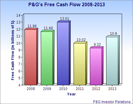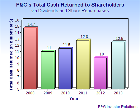 So far in fiscal 2014, P&G has generated $6.85 billion in free cash flow and used this to pay approximately $5.1 billion in dividends and repurchase approximately $5.5 billion of its common stock; here's how this breaks down by quarter: