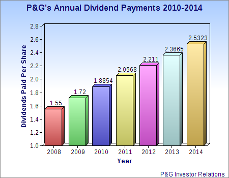 P&G has paid dividends every year since its incorporation in 1890, resulting in an incredible 124 years of payments. In addition, the company has raised its dividend for 58 consecutive years, with the most recent increase coming on April 7. Here's a chart of P&G's annual dividend payments per share since 2008, including the projected payment in 2014: