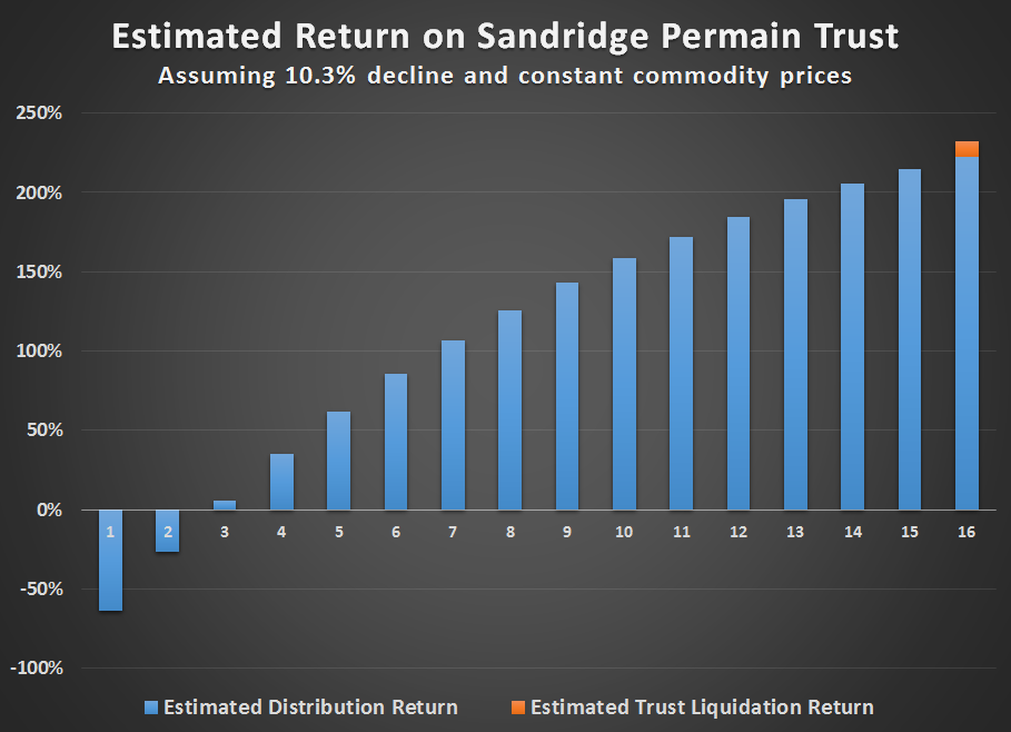 Using this decline estimate and the current annual distribution, we can project a rough estimate of the trust's longtime return. Let's assume the trust's distribution declines at the same rate as production and that when the trust is liquidated at the end of its life, you get 10% of the current value of the trust. Using this assumption, the estimated return over the life of the trust would look something like this: