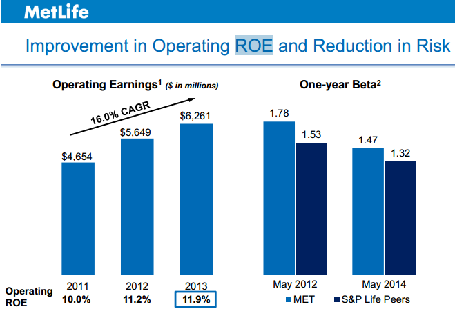 MetLife's long-term (by 2016) core operating earnings growth target of 7%-8%, and ROE target of 12%-14% -- 11%-13% with no share buybacks -- appears reasonable vs. 12% in 2013. I think the company can achieve the low end of this target, even with the headwinds from low interest rates, and a slower than expected pace of capital return.