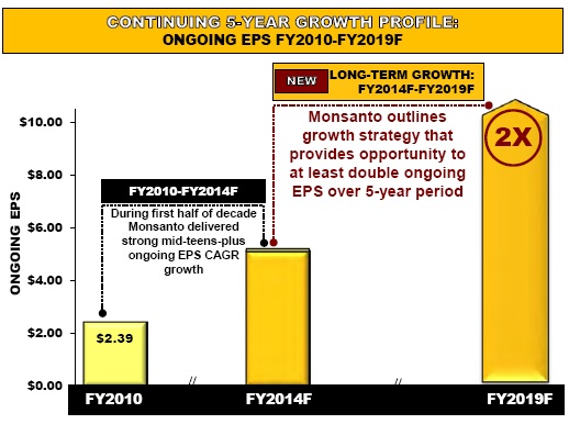 Monsanto outlined a long-term growth plan that should make any investor drool. It hopes to at least double its earnings per share within the next five years. How many times have you come across a company that's so confident about its future despite running a business that's mired in controversies? The following graph captures Monsanto's long-term vision.