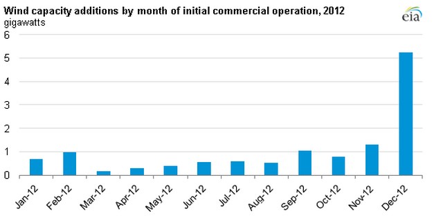 The move was meant to incentivize wind energy investment -- and it worked like a charm. In December 2012, the final month before the PTC first expired (it was subsequently extended through 2013), utilities scrambled to bring last-minute wind projects online.