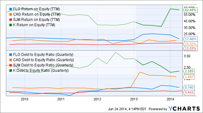 High debt levels aren't uncommon in the packaged food industry as firms seek to grow by acquisition, which is funded by debt many times. Companies are often so concerned to grow the number of brands and the scope of their products that they venture outside of their "bread and butter" and do not always make reasonable acquisitions. This can cause long-term return on equity to decline as a company grows.