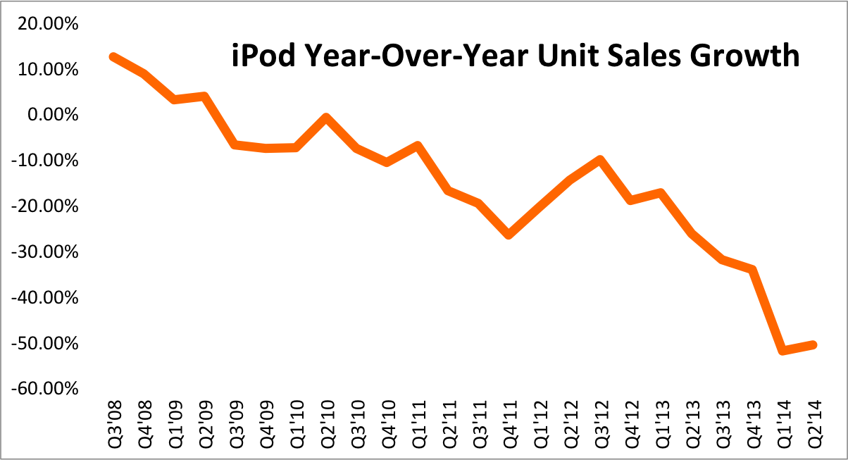 While the declining business used to be big enough to affect Apple's overall revenue growth rates, Leitao explains, the business is now becoming to small to even matter. This fiscal year, Leitao predicts the iPod line will contribute just $2 billion of revenue. While that number may sound big, it accounts for only about 1% of Apple's projected fiscal 2014 total revenue.