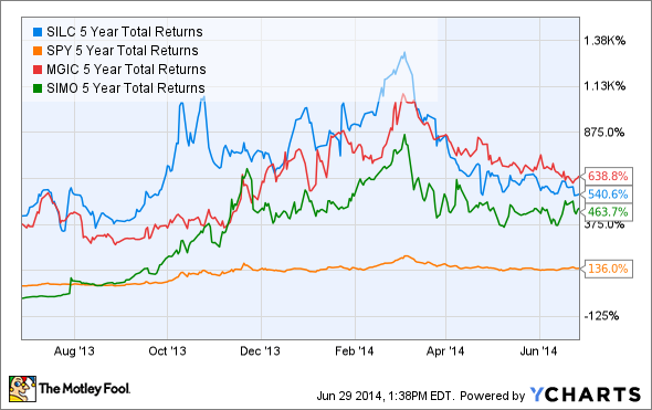 Source: From the Motley Fools CAPS pages. Silicon Motion's earnings were negative five years ago. It's three year earnings growth rate was 64.5%.