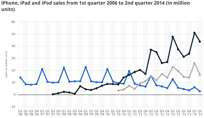 Sales have continued to decline for the iPod, with only the holiday boosts providing revenue peaks.