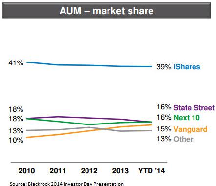 Although State Street owns the largest ETF by assets in the market, Blackrock is the clear leader in total ETF assets managed. At the end of 2013, Blackrock managed over 900 billion in assets in iShares alone, easily dwarfing State Street's SPDRs and Wisdom Tree's funds.