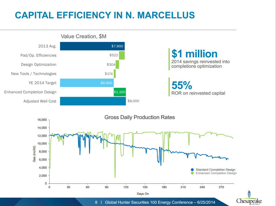 As that slide notes, Chesapeake Energy is using pad drilling efficiencies, well design optimization, and new tools and technologies to cut a million dollars from its northern Marcellus well costs. But instead of taking that money and using it toward drilling its next well, the company is choosing to reinvest it in that very same well on an enhanced completion design. It's finding that the incremental return on that capital is money very well spent as it's earning a 55% rate of return on that reinvested capital. Just as important, the enhanced design is keeping its production flat instead of allowing the natural decline rate to take over after a few months.
