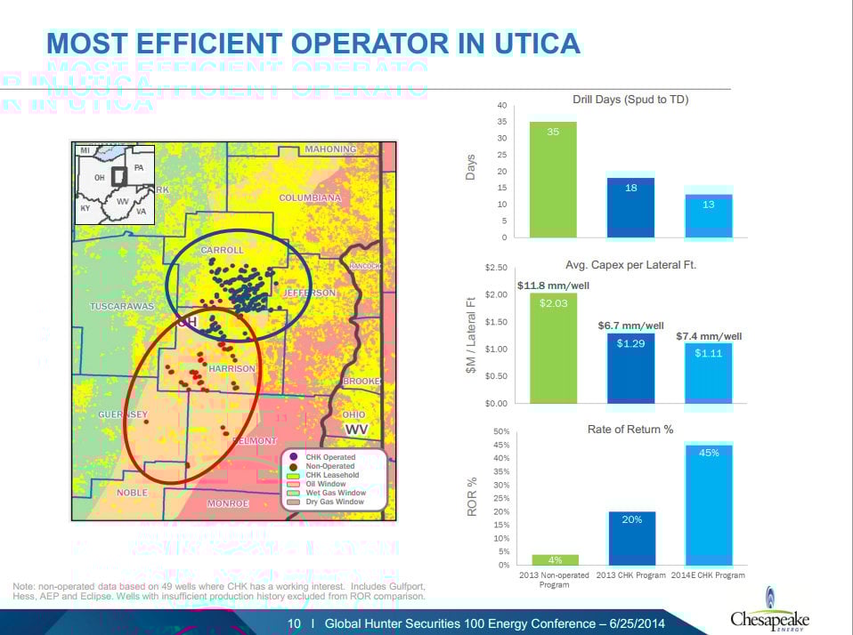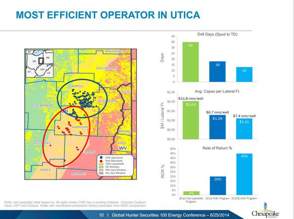 As that slide notes, last year Chesapeake Energy saw a 20% rate of return on the capital it spent on each Utica Shale well. But by reinvesting some of its savings the company is able to boost its rate of return to a much more robust 45% this year. This is a prime example of how spending money can indeed make more money.