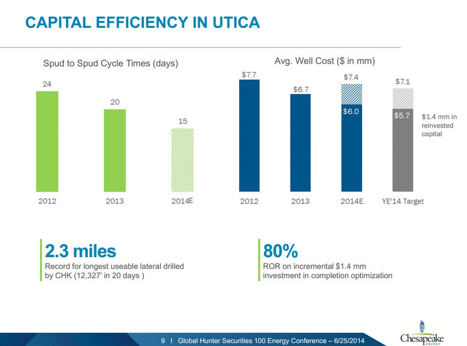 Chesapeake Energy is seeing the same thing in the Utica Shale. In becoming a more efficient driller in the play, including lopping off nine drilling days over the past two years, Chesapeake Energy is slashing $2 million off its base well costs. But as the following slide shows, it sees greater value in reinvesting most of those savings back into each well.