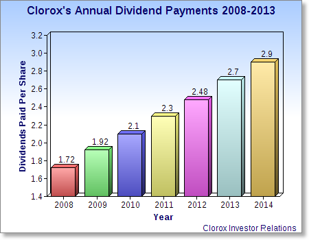 Clorox has paid dividends to shareholders every year since 1968, resulting in an impressive 46 consecutive years of payments; however, even more impressive is the fact that the company has increased its dividend every year since 1977, equating to an incredible 37 consecutive years of increases, with the most recent coming on May 12, 2014. Take a look at this chart of Clorox's annual dividend payments per share since 2008, including the projected payment in 2014: