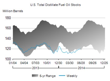 Distillates supplies, which include diesel and heating oil, grew 1.2 million barrels (1%) for the fourth straight week of expansions. Distillates demand for the last four weeks is down a seasonally adjusted 1.5%. In the past year, distillates inventories have shrunk 2.1%.