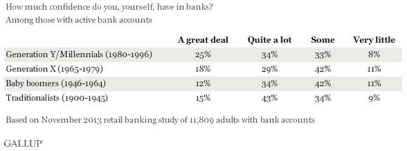 The data also points to increased skepticism among baby boomers, which is troubling considering how American demographics are changing. Baby boomers represent the largest share of banking customers and "[29%] of them have more than a $100, 000 in investable household assets, compared with 19% of Generation X and 12% of Generation Y".