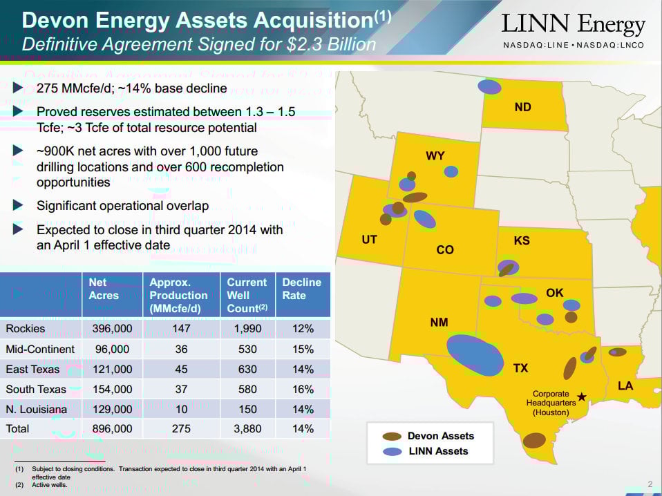 LINN Energy (LINE +0.00%) and LinnCo (NASDAQ: LNCO) announced today that LINN Energy has finalized a deal to acquire Devon Energy's (DVN +0.43%) noncore U.S. natural-gas assets. The $2.3 billion deal will be funded by the future sale of LINN Energy's position in the liquids-rich Granite Wash.
