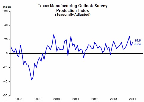 After clocking in at 8.0 for May, this month's report puts business activity up to 11.4. The Dallas Fed's production index tells a similar tale, increasing 4.5 points to hit 15.5 for June. A positive number indicates month-over-month growth, while a negative number means contraction.