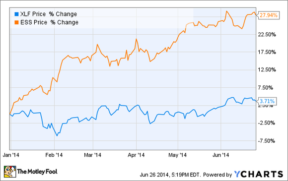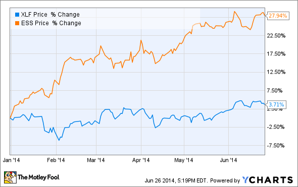 While India's market boom is certainly impressive, the third best-performing large cap financial stock for the first half of this year is as American as apple pie: apartment real estate investment trust (REIT) Essex Property Trust. Shares of Essex have jumped 28% so far in 2014.