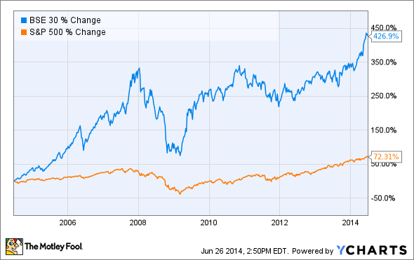Although the growth rate of the Indian economy has slowed from 10.5% in 2010 to 4.8% in 2013, India's GDP growth rate remains twice as high as the U.S. growth rate. However, strong growth such as this comes at a price, and when the time frame in extended to 10 years, it's easy to see that the Sensex is much more volatile and unstable than the U.S. market.