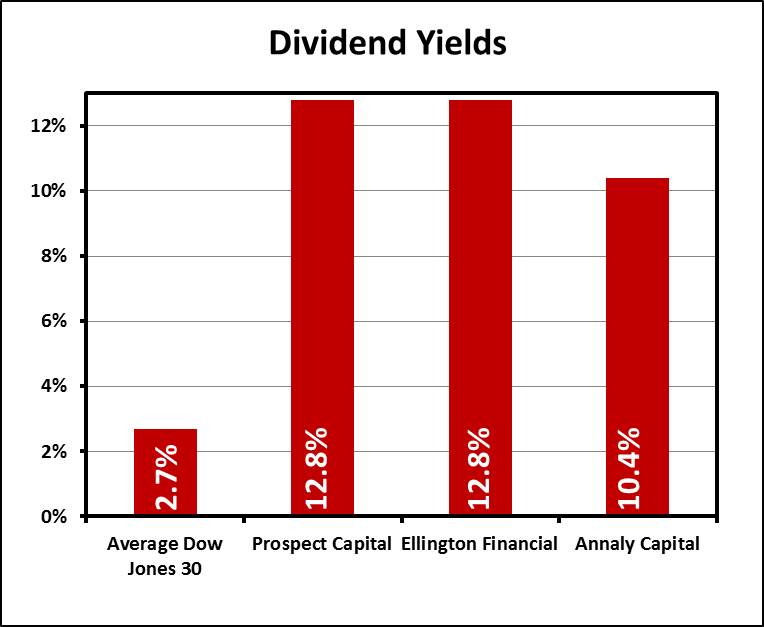 The current average dividend yield of the Dow Jones 30 is about 2.7%. While a 2-3% yield can certainly be a nice profit-generator for your portfolio, it pales in comparison to the yields of business development companies, such as Prospect Capital Corporation (PSEC +0.00%), master limited partnerships, such as Ellington Financial LLC (EFC +0.43%), and real estate investment trusts like Annaly Capital Management (NLY +1.02%).