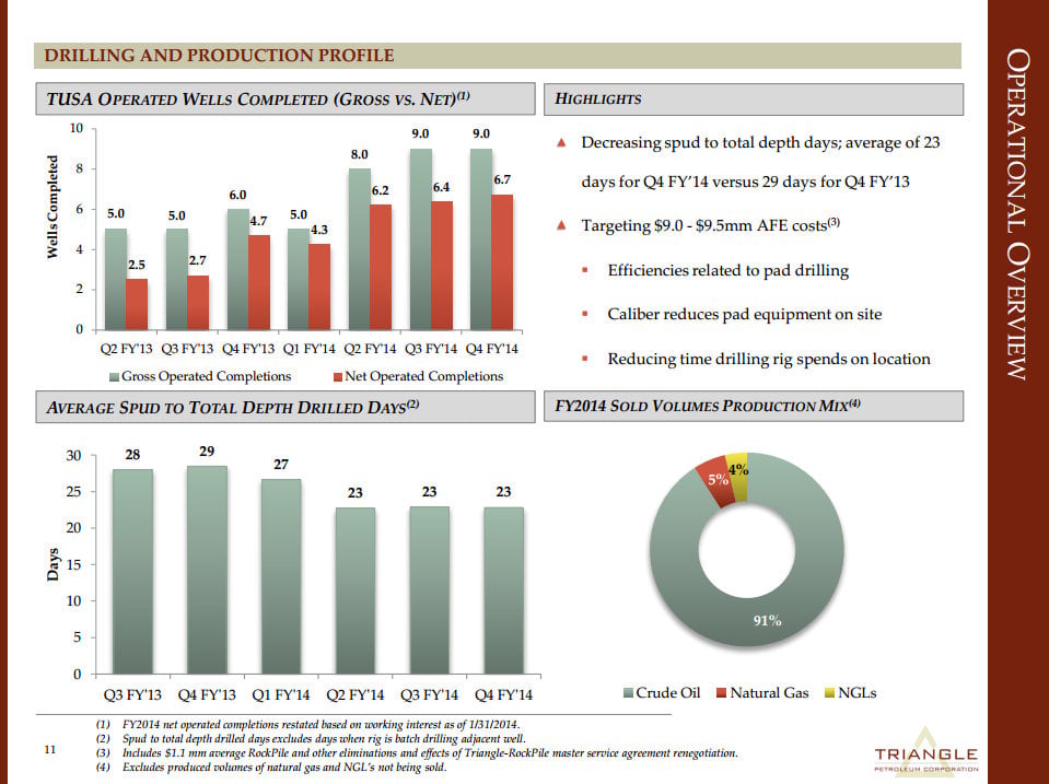 Meanwhile, peers like Northern Oil & Gas and Triangle Petroleum don't always have as much control, which does have an impact on results. Triangle Petroleum is actually focusing more of its efforts on drilling wells that it operates. In the first quarter of last year all of the wells it participated in were nonoperated, however, as of last quarter it boosted its operated wells to 80% of its volumes. In doing so it is able to control more of its costs, which is why we're seeing its drilling days and well costs fall as the following slide notes.