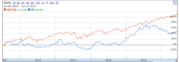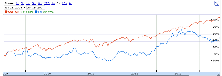Toyota's stock has underperformed S&P over the past five years. The company's stock dipped at the various occasions because of the economic downturn, recalls, and recently because of Crimean issue, however, similar to its peers, the stock has been rebounding.
