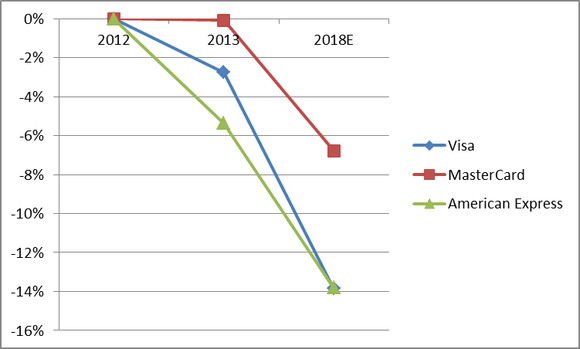 Unfortunately for Visa shareholders, the company has already had a peek at the market-share slide that's predicted for the company in the near future. Compared to 2012, Visa's market share fell by 3%, while MasterCard was flat, and American Express was down 5%. The picture for 2018 is a bit more dramatic: