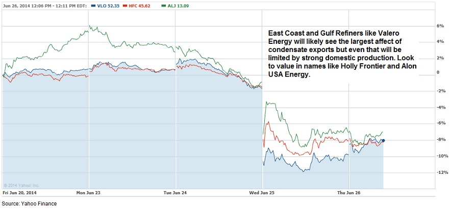 Ultimately, ever higher domestic production should bring down the price of WTI crude and support prices for refiners. Insurgent attacks in Iraq have driven up both WTI and Brent lately but have not affected supply out of the country, a good sign for future prices. A full reversal of the crude export ban could send prices spiking and is just not on the political calendar. Condensates were approved because Washington knows that it will likely have little effect on prices but would allow them to quiet those calling for more exports. Take advantage of the fear in the refinery space to add strong names to your portfolio.