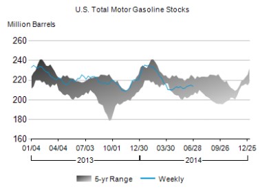 Distillates supplies, which include diesel and heating oil, increased 1.0 million barrels (0.7%) for the fifth-straight week of expansions. Distillates demand for the last four weeks is down a seasonally adjusted 8.0%. In the past year, distillates inventories have edged up 0.6%.