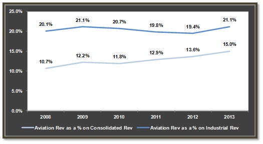 GE aviation has shown impressive results in the past quarter, where revenue grew 14% to $5.8 billion on account of higher shipment volumes and strong order pricing. The division accounted for around 15% of General Electric's consolidated sales, with the proportion rising continuously in the past few years.