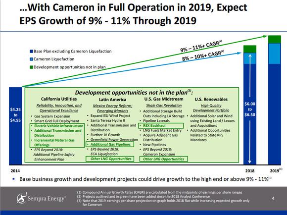 Utilities aren't known to be growth stocks. Instead, most utilities are focused on generating predictable cash flow that can be distributed to investors via dividends. What's unique about Sempra Energy is that it, too, is focused on generating predictable cash flow, so its risk profile is similar to both Consolidated Edison and FirstEnergy. However, in addition to that low-risk profile, the company is loaded with earnings growth potential. Currently, Sempra Energy expects to grow its earnings by 9%-11% per year through 2019, while its peers in the utility sector are only expecting about 5% annual earnings growth during that same time frame.