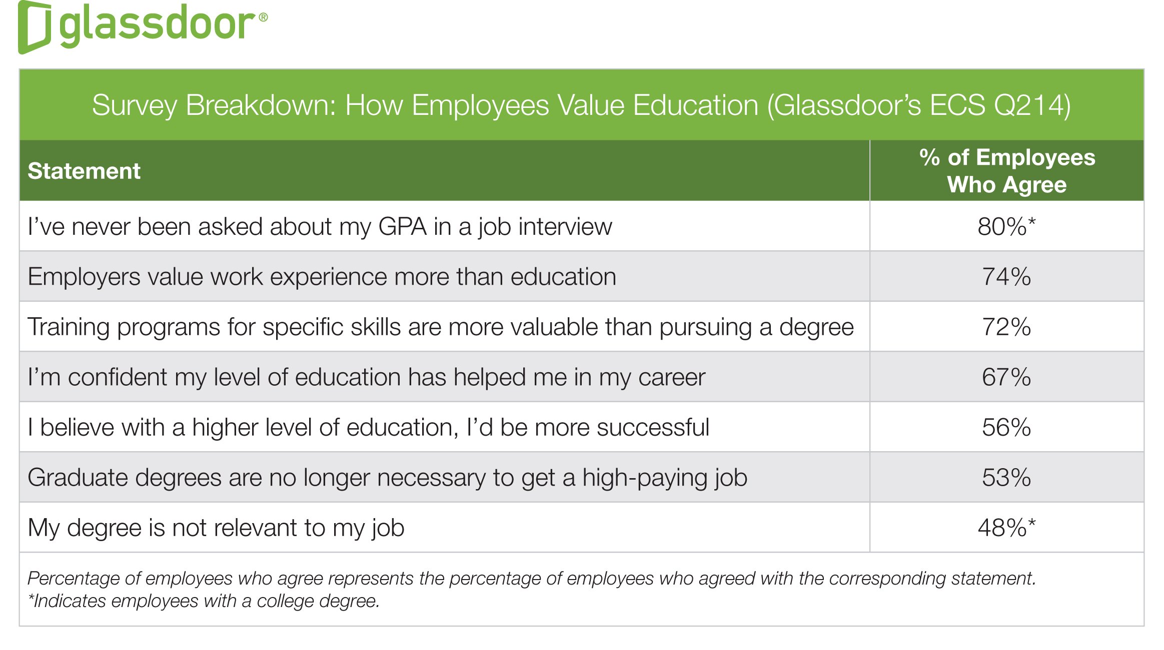 That's not to discount the value of a college degree. More than half of the surveyed workers, 56%, said that they thought a more advanced degree would help them advance their careers. And 67% of degreed employees in the survey said they felt their degree was an asset to their career.