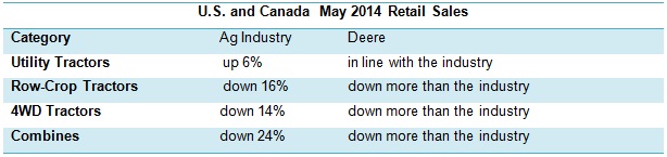 The data from Deere's "May retail sales comment" shows that industry retail sales volumes are down severely for most product categories other than utility tractors, and Deere is feeling the heat even more than the industry. In the first quarter, Agco's tractor and combine production volume dropped 9%; the company predicts full-year sales to fall 5% in this space.