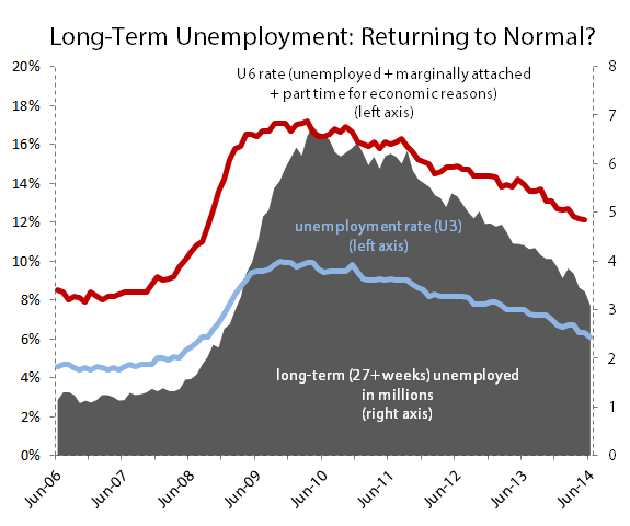 While unemployment remains elevated above pre-crisis levels, it's encouraging to see that long-term unemployment is falling fast from the historic highs it reached in 2009 and 2010. There are now nearly 1.2 million fewer long-term unemployed -- those who haven't found work for at least 27 weeks -- than there were a year ago; June alone saw 293,000 people leave the ranks of the long-term unemployed: