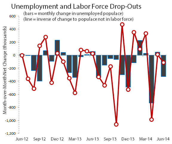 Additionally, the median duration of unemployment continues to drop rapidly, from 25 weeks coming out of the recession to just 13.1 weeks today. Unfortunately, this good news hides a deeper problem. While some of the long-term unemployed certainly have found jobs at last, there were also 111,000 fewer people in the labor force in June than in May. All told, 2.3 million fewer people are unemployed now than a year ago, but 2.4 million fewer people are part of the labor force. In any given month, much of the improvement in unemployment figures can simply be chalked up to the fact that fewer people are choosing to look for work: