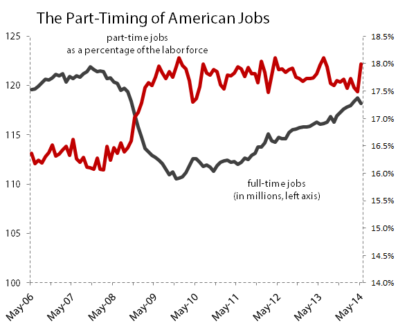 Shrinking unemployment and growing payrolls are always good signs for a stronger economy. However, the nature of these changes matters. If unemployment is low primarily due to labor force dropouts, and if employment growth is being driven by hundreds of thousands of low-earning part-time workers rather than growth in valuable and fairly remunerative full-time positions, the American economy will have a harder time getting back to "normal," whatever that might mean.