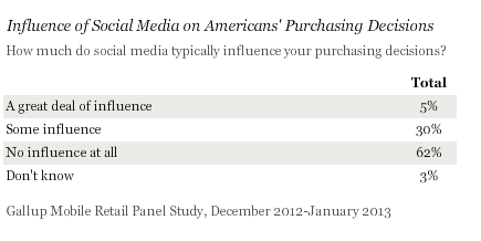 However, Gallup offers another rationale for its findings: "In the State of the American Consumer report, Gallup reveals that consumers who engage with brands often do so when they are already attached to a product or service. Companies that engage their customers -- by providing exceptional service and a pleasurable in-store experience -- will, in turn, drive those customers to interact with them on social media. Simply promoting products and services on Facebook or Twitter is unlikely to lead to sales."