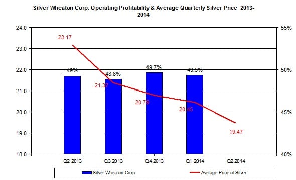 Silver Wheaton has streaming contracts with leading gold and silver producers such as Barrick Gold (NYSE: ABX) so that it receives precious metals for a low and nearly unchanged price; it receives silver for a cash cost of around $4 per ounce, and receives gold for nearly $400 per ounce. This means the company's cash costs aren't likely to change, which brings its operational risk down. This puts the company's operations at a smaller risk than silver producers, which have to face growing production costs.