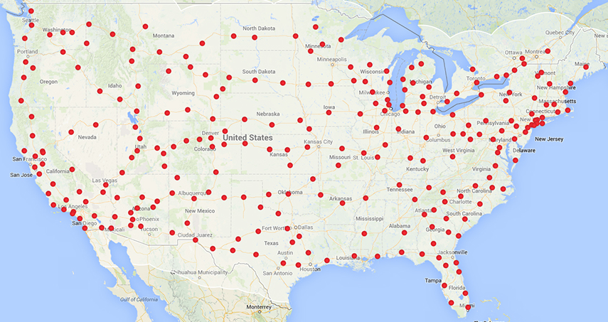 Tesla's planned Supercharger locations by 2015. The locations above will put a station within Tesla driving range of 98% of the U.S. population. Image source: Tesla Motors.