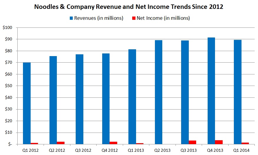 Top and bottom line numbers for Noodles & Company during their fiscal first-quarter 2014 earnings showed revenues increased 10.1% to $89.5 million, which resulted in net income jumping 56% to $1.4 million. Same-restaurant sales, however, dipped 1.6% because of lost traffic from the severe winter weather in the Northeast.