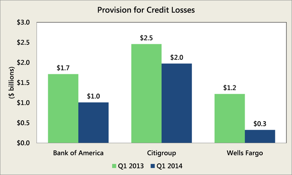 While there is a wide variety among what the banks expect to lose -- that is another story for another day -- you can see Bank of America, Citigroup, and Wells Fargo all saw their provision for credit losses decline dramatically through the first three months of the year: