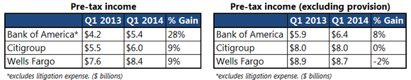 Without diving too far down into the numbers, banks are remarkably simple. They earn net interest income -- what they take in from loans minus what they pay out on their borrowings -- and noninterest income, which are those fees charged to customers. And they of course have expenses, which are paid out to keep everything running smoothly. Add the first two together, and subtract out the expenses, and boom, you have their pretax income.