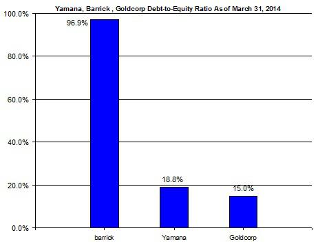 One of the main differences between Goldcorp and Barrick Gold is the level of debt. The chart below demonstrates this gap by showing these companies' debt-to-equity ratios.