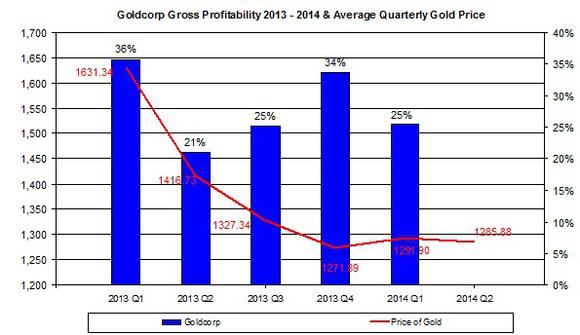 According to chart above, the drop in the price of gold didn't actually drag down Goldcorp's profitability in the past couple of quarters.